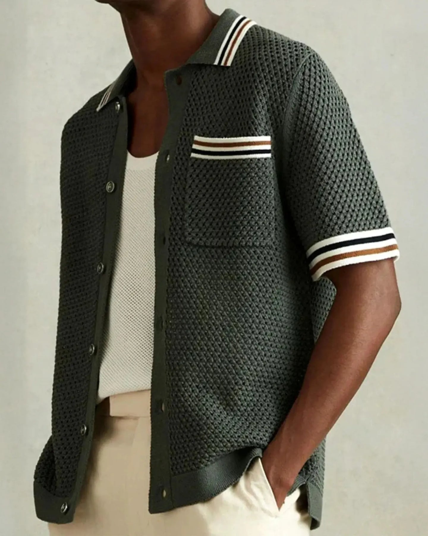 Crafted from a breathable cotton blend, this open-stitch crochet shirt offers a refined take on casual luxury, finished with contrast trims and a structured spread collar.