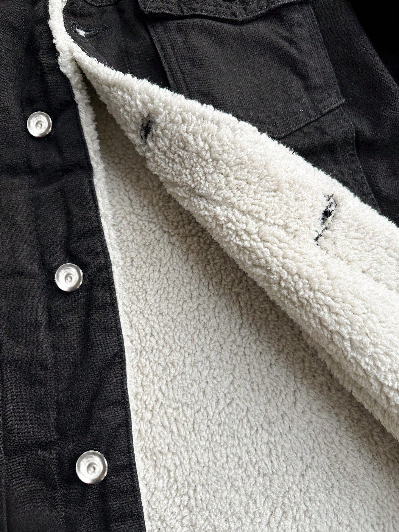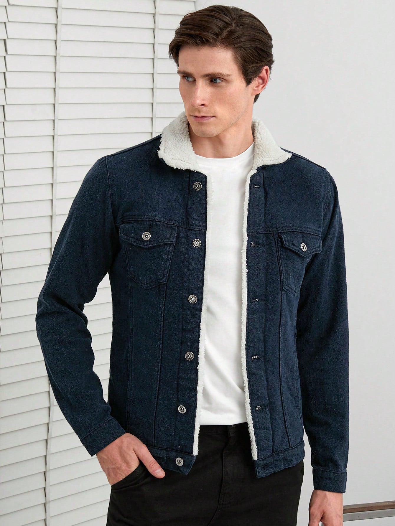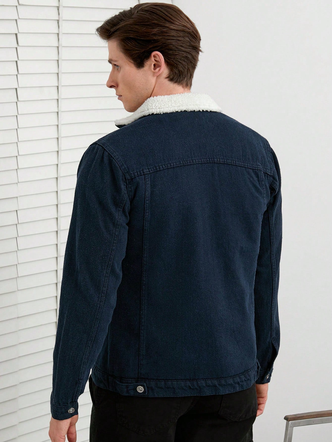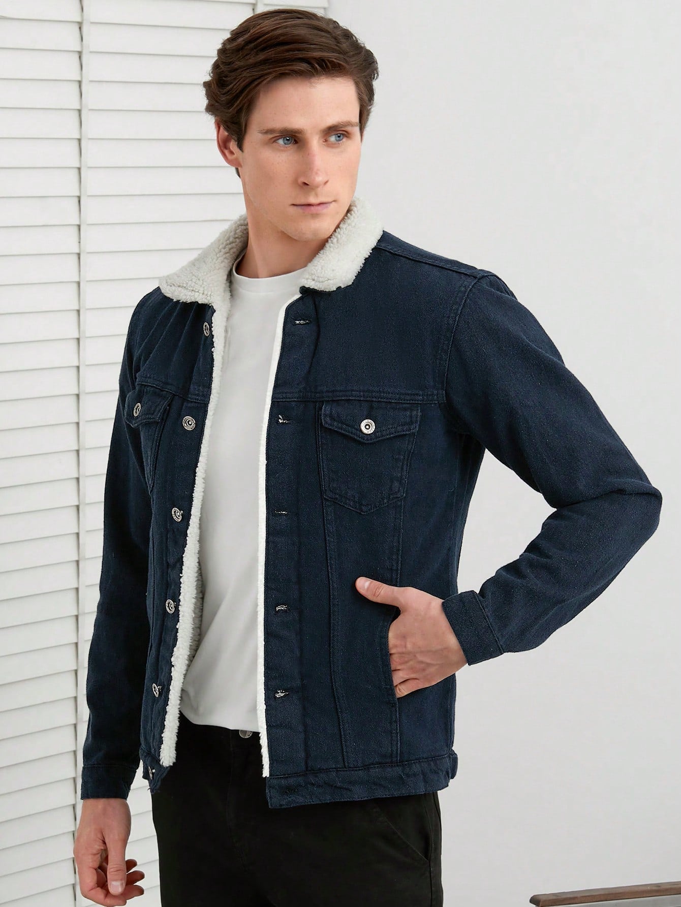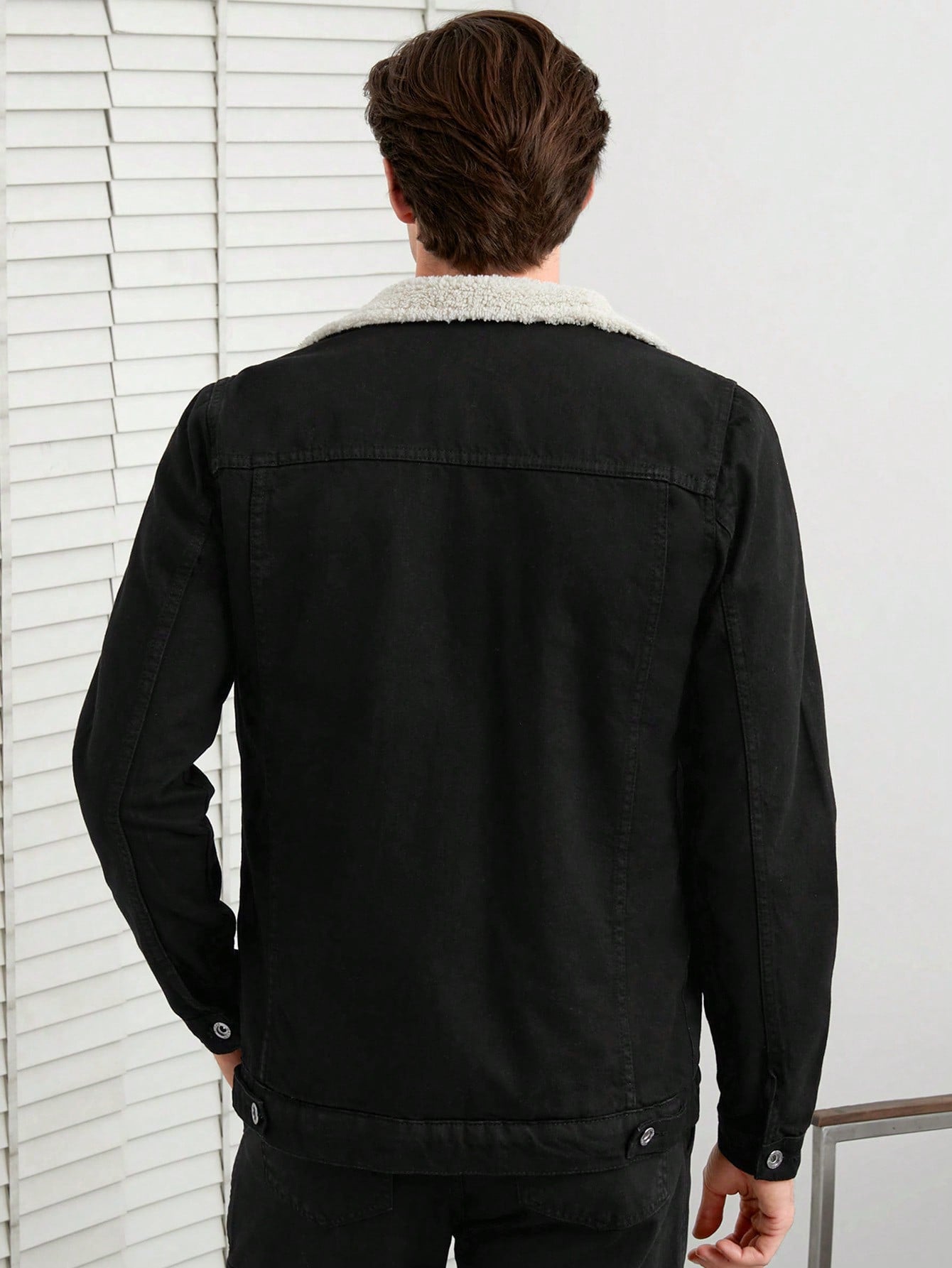 This stylish black denim jacket with a sherpa-lined collar is a timeless wardrobe essential, blending comfort and rugged charm for a versatile look. Its sleek fit and warm lining make it an ideal choice for cooler days.