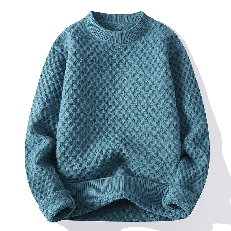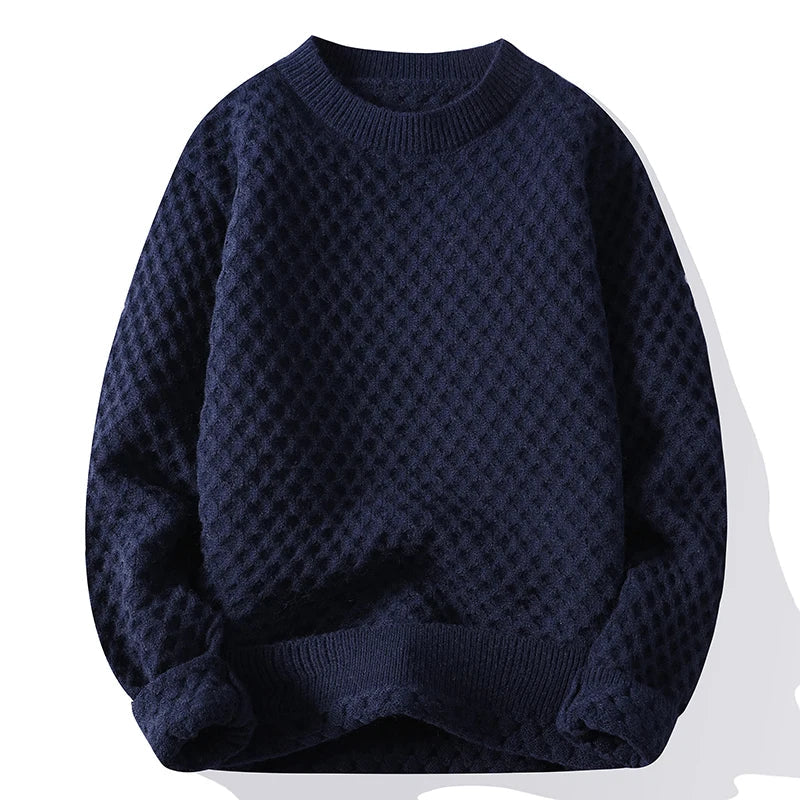 This navy blue sweater is a refined and versatile piece perfect for cooler seasons. Its intricate knit design adds sophistication, making it suitable for both casual and semi-formal settings.